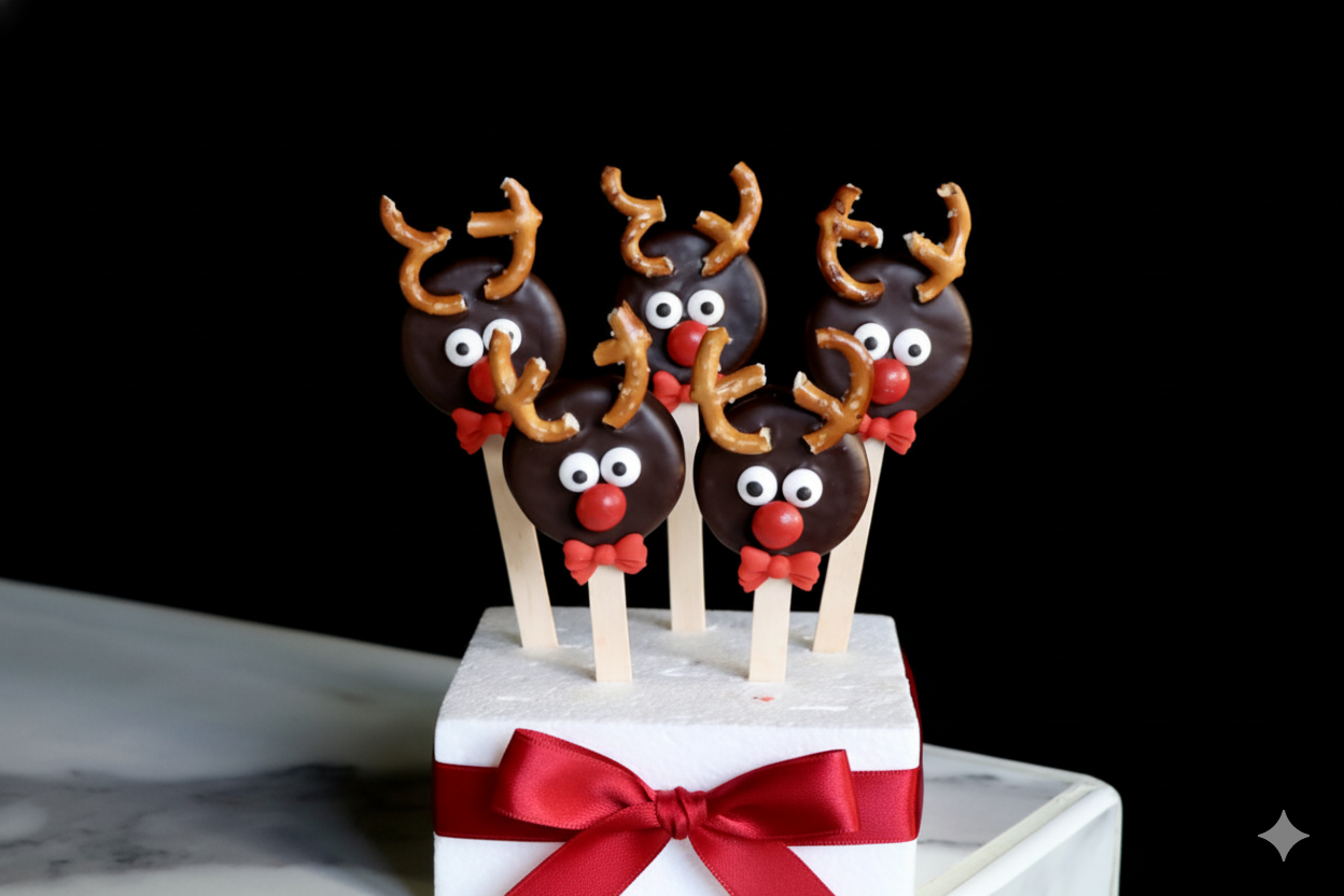Get ready for the holidays with these charming chocolate-covered Oreo pops. Each pop features a delicious Oreo cookie dipped in rich chocolate, adorned with crunchy pretzel antlers, sweet candy eyes, and a bright red skittle nose. Perfect for stocking stuffers, holiday parties, or a sweet treat under the Christmas tree!