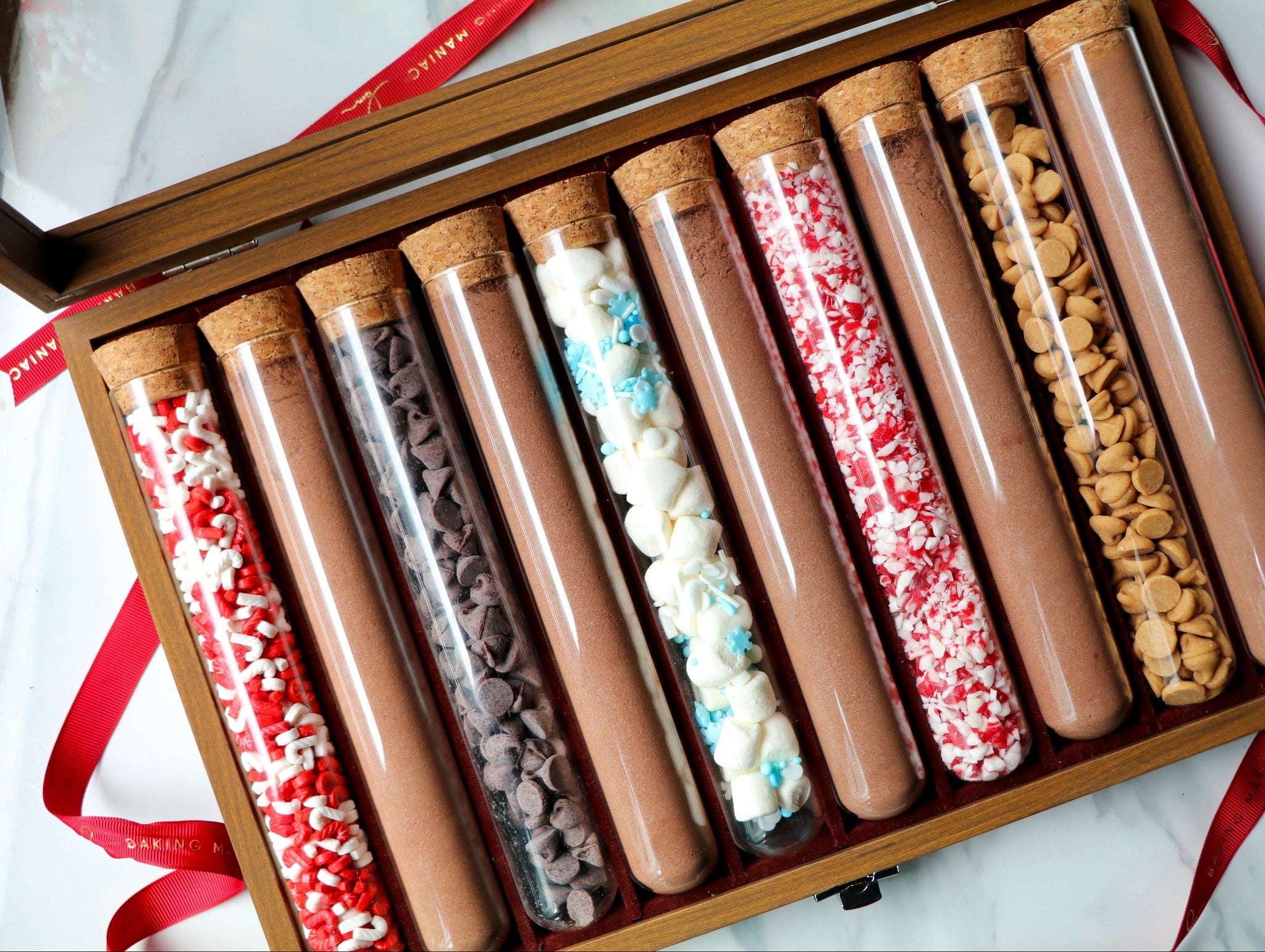 This stunning wooden gift box features a collection of ten individual test tubes filled with rich cocoa mix and delicious toppings. Explore a variety of flavors and textures, including classic hot cocoa, mini marshmallows, crunchy peppermint bits, chocolate chips, and peanut butter chips.